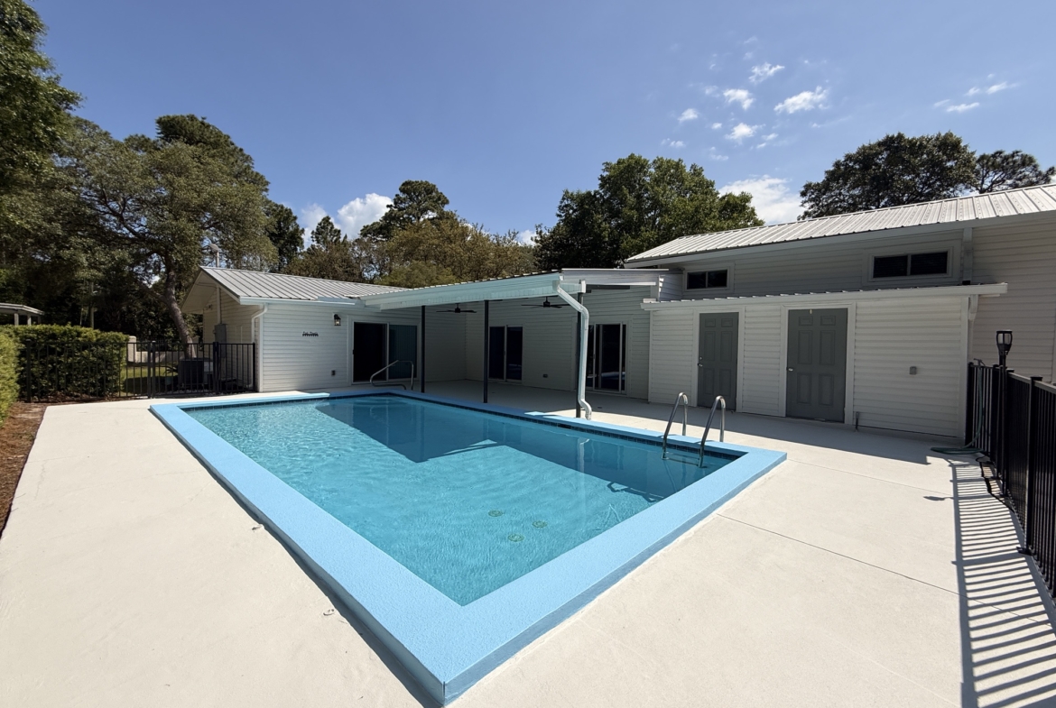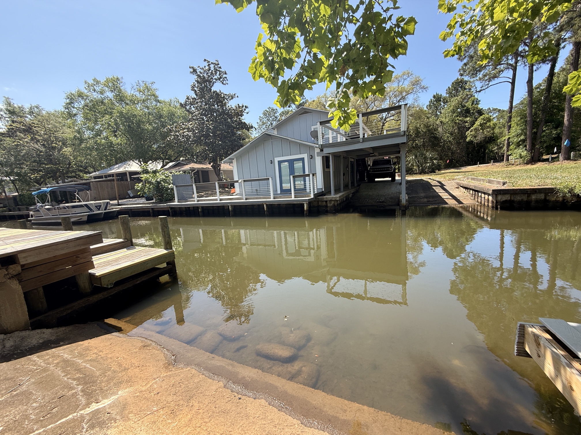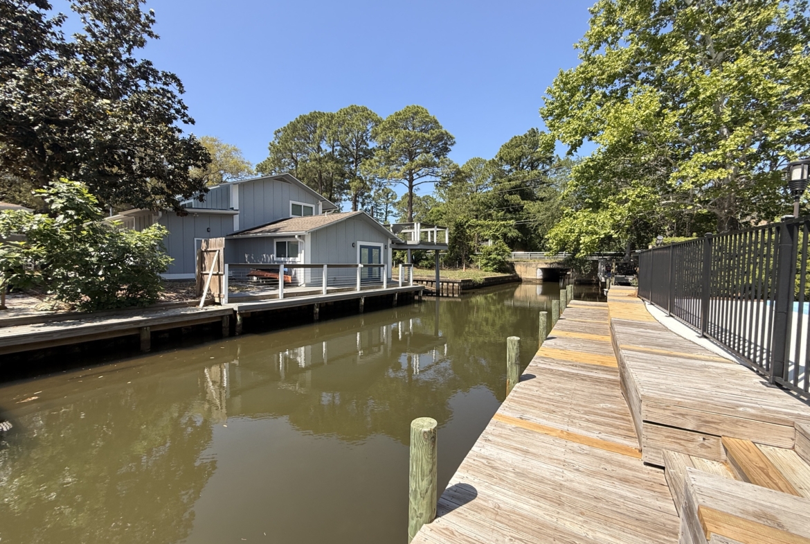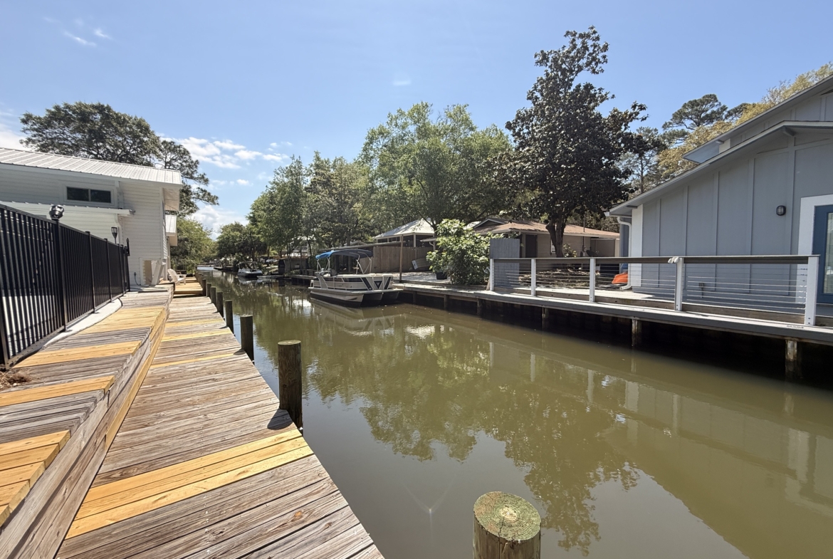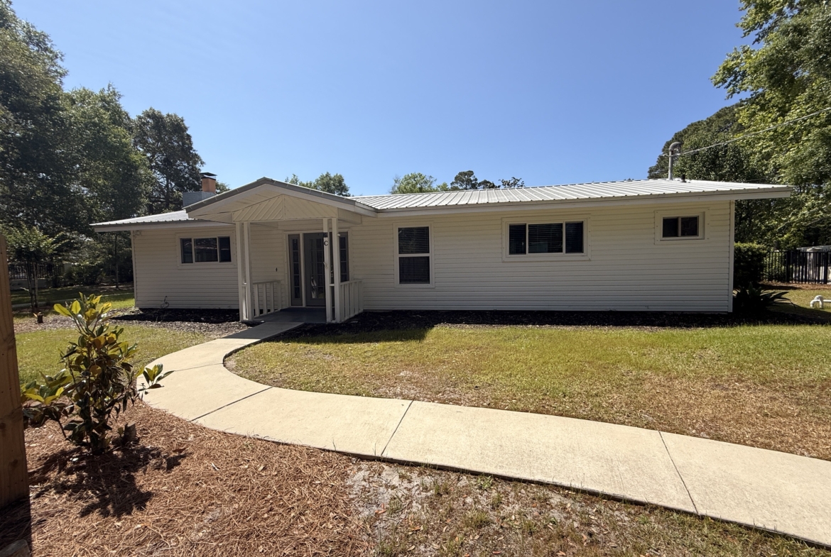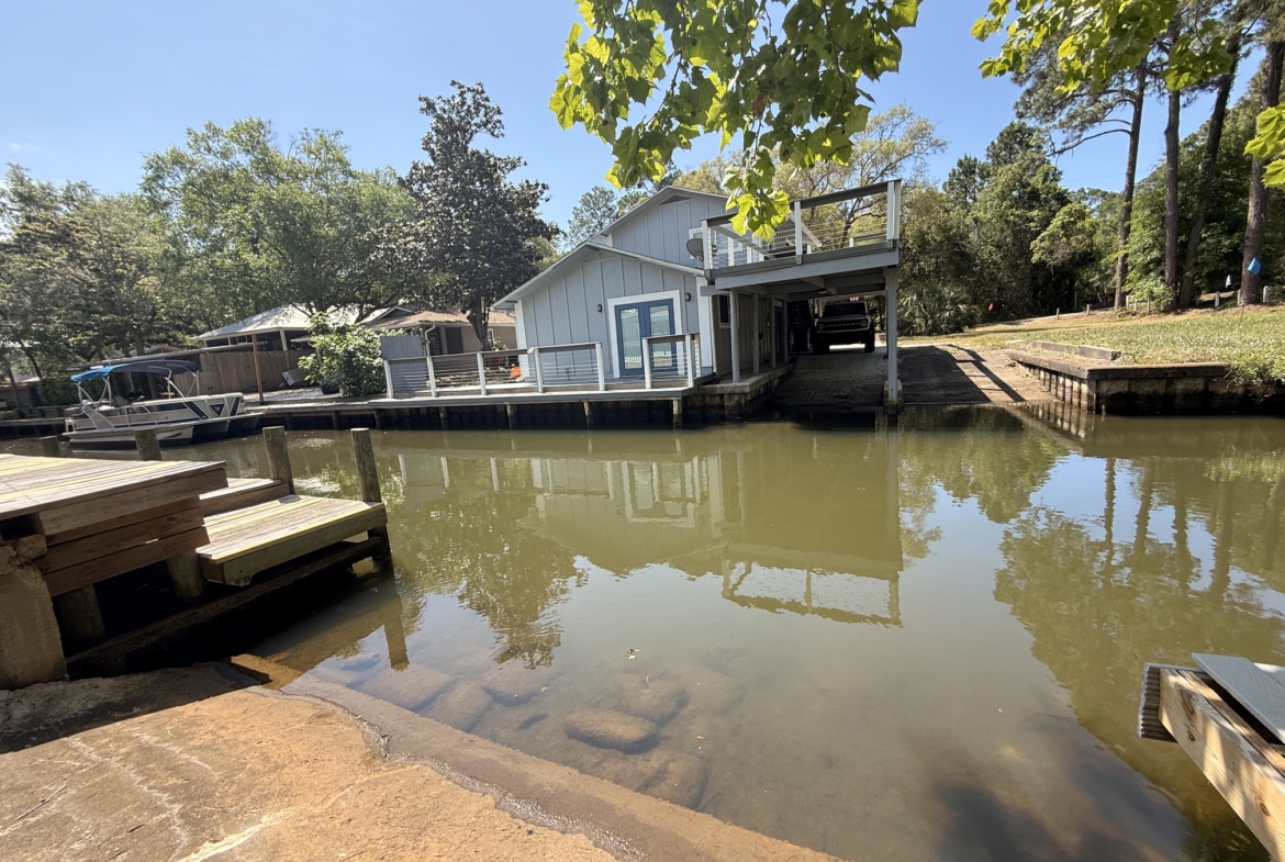 Unique canal water front home with 150 feet of water frontage. Canal leads 300 feet directly to Mack Bayou. Private boat launch will accommodate up to 17 or 18 ft boat. Covered boat house will accommodate kayak, SUP or canoe. 3 bedroom 2 bath with carport, fireplace, spacious living room, screened lanai overlooking wonderful outside private pool